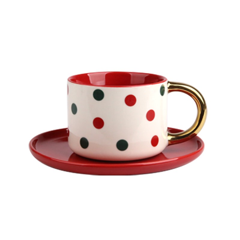 200ml Christmas Cup and Saucer Set - Festive Polka Dot, Star, Striped Designs with Gold Handles