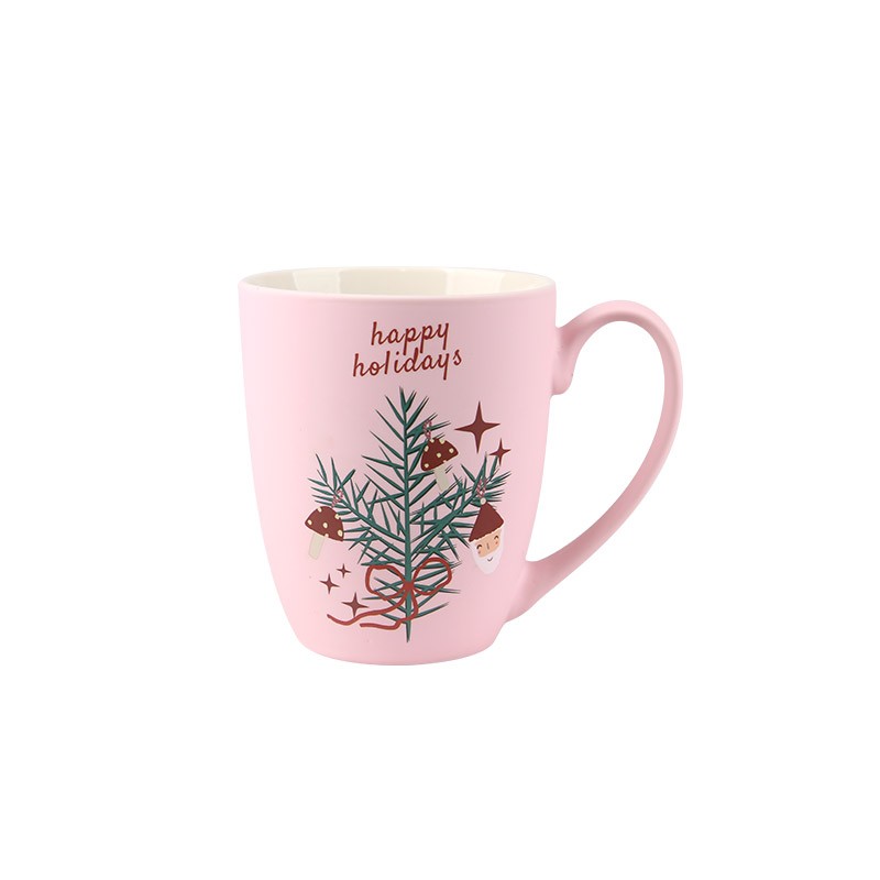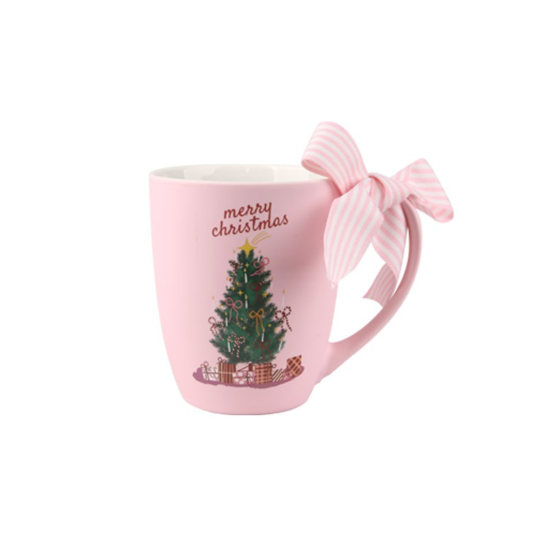 A light pink mug with a Christmas tree and “merry & bright” lettering.