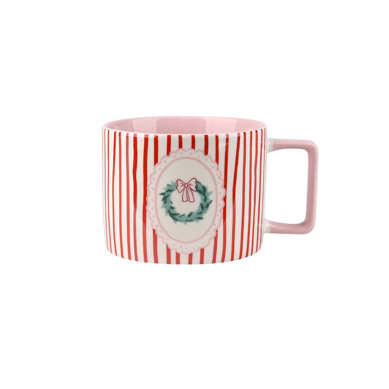 A red-and-white striped mug with a wreath design.