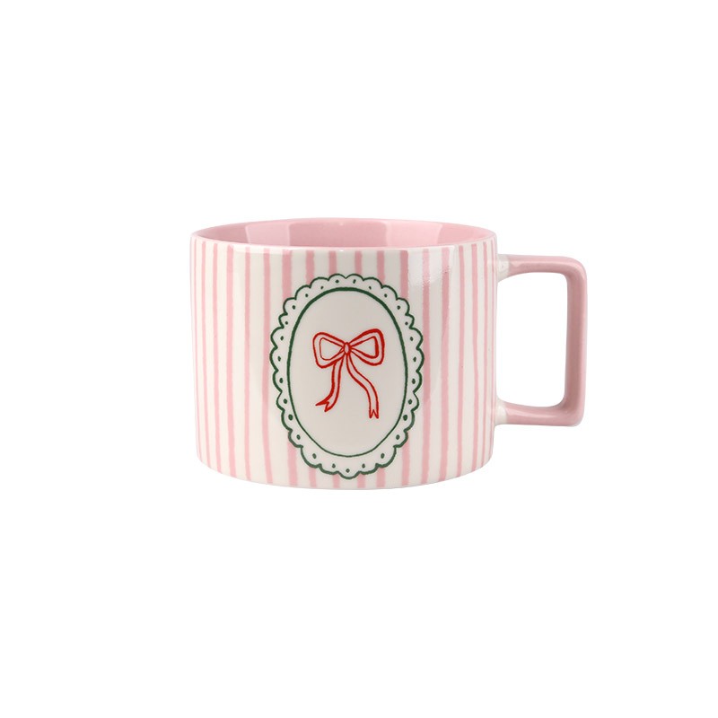 A pink mug with a bow design.