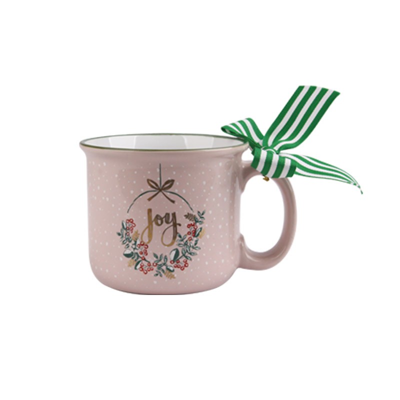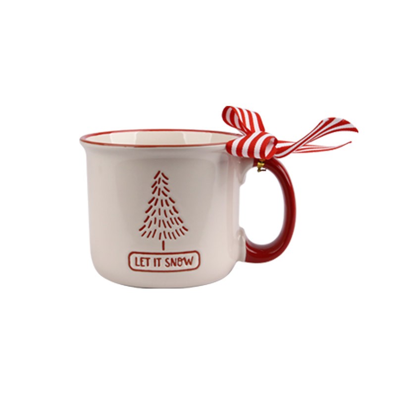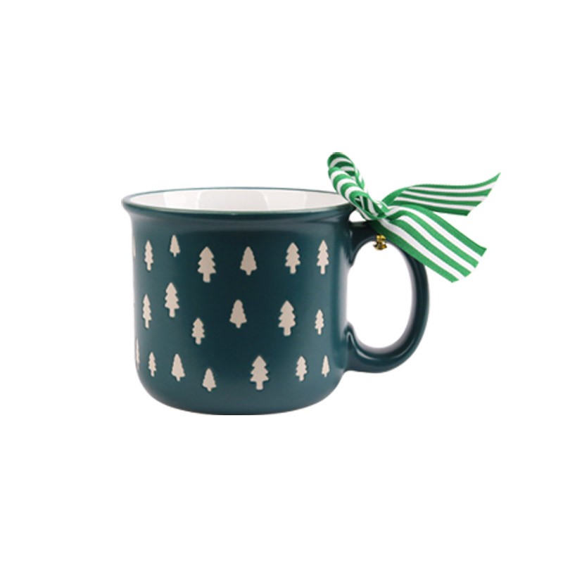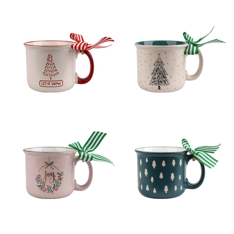 480ml Christmas Ceramic Mug Set - Festive Tree, “Joy” & Forest Designs with Ribbon Accents
