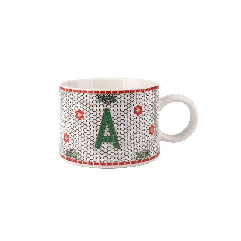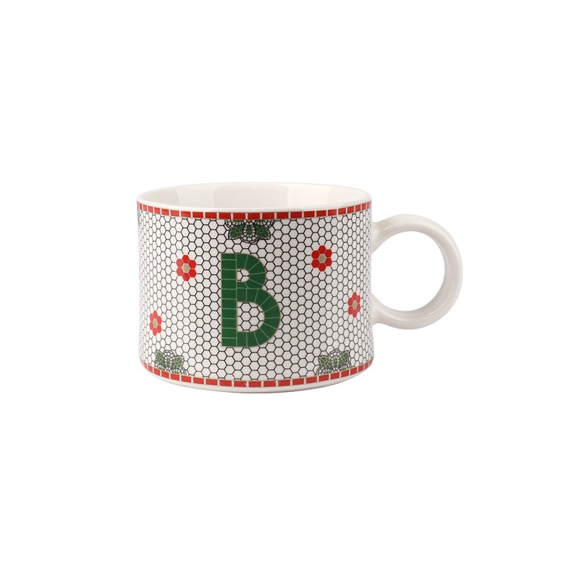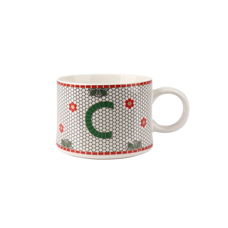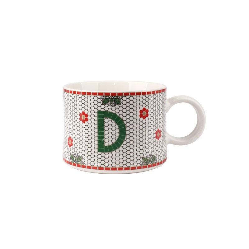 Personalized Monogram Designs: Each 480ml mug (dimensions: D105mm x H81mm x M110mm) showcases a distinct initial—A, B, C, D—set against a backdrop of festive Christmas motifs, including holly leaves, red accents, and geometric patterns. These designs add a customized, sophisticated touch to every sip.