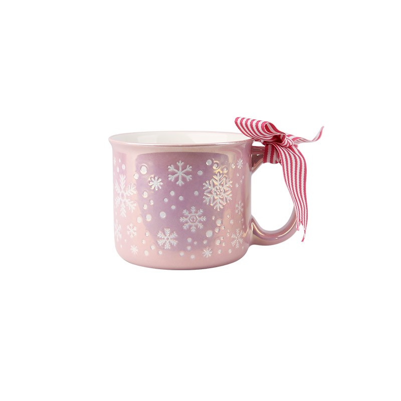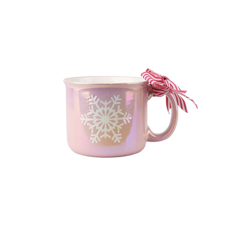 A mug with delicate snowflake patterns, paired with a red-and-white ribbon.