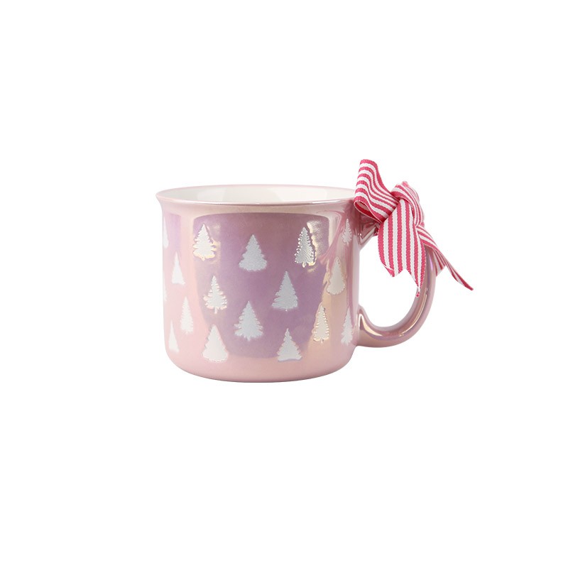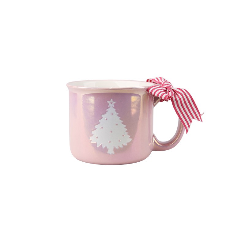 A mug with a single Christmas tree, adorned with a red-and-white ribbon.