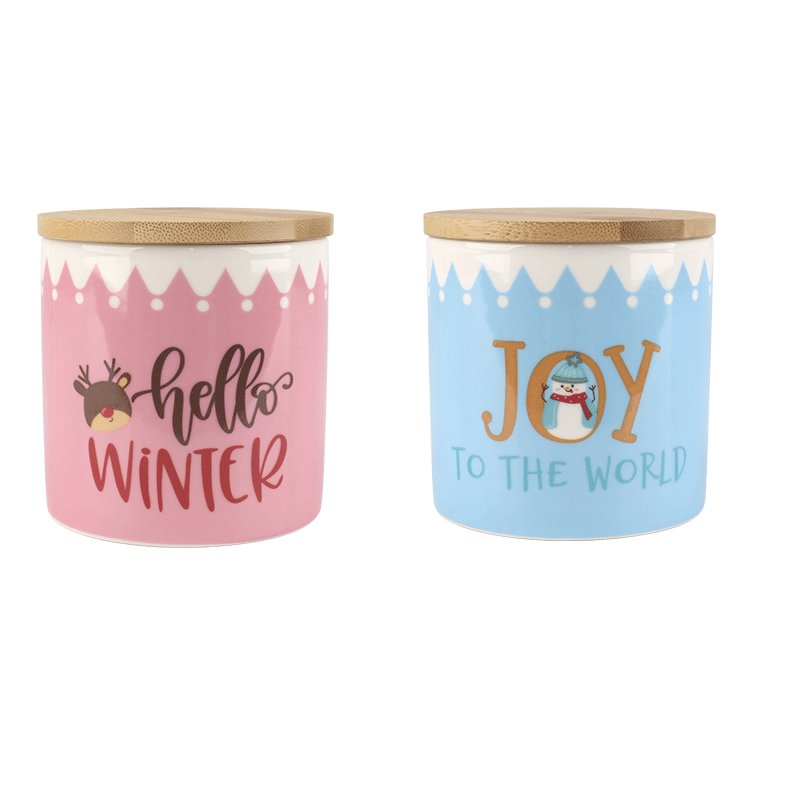 Charming Winter Designs: Offered in lovely winter hues (showcased here: a pink jar with “hello WINTER” and a blue jar with “JOY TO THE WORLD”) to complement any kitchen decor, from cozy to festive.